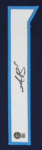 This Autographed Navy Blue Pro Style Framed Jersey has been Personally Signed by A.J. Brown of the Tennessee Titans. This item is 100% Authentic to include a Certificate of Authenticity (COA) / hologram by Beckett Authentication Services. This is a BAS Witnessed Protection Program item which means a Beckett Authentication Service representative was present when this item was being signed. We conducted an autograph signing with A.J. Brown where multiples of the same item were signed. While the photographs are representative of this item, the size, placement and strength of the signature may vary. Each item is hand signed, therefore, each autograph is unique. This item can be verified through BAS Witnessed. This item has been professionally framed to overall dimensions of approximately 32 x 37 inches. This is a X-Large sized, non-branded, custom-stitched Framed Jersey.