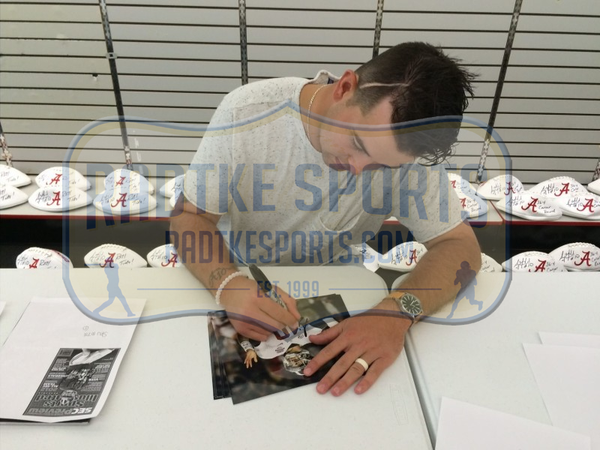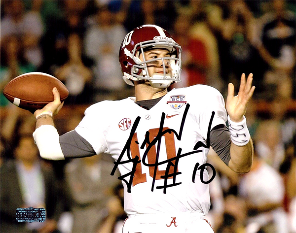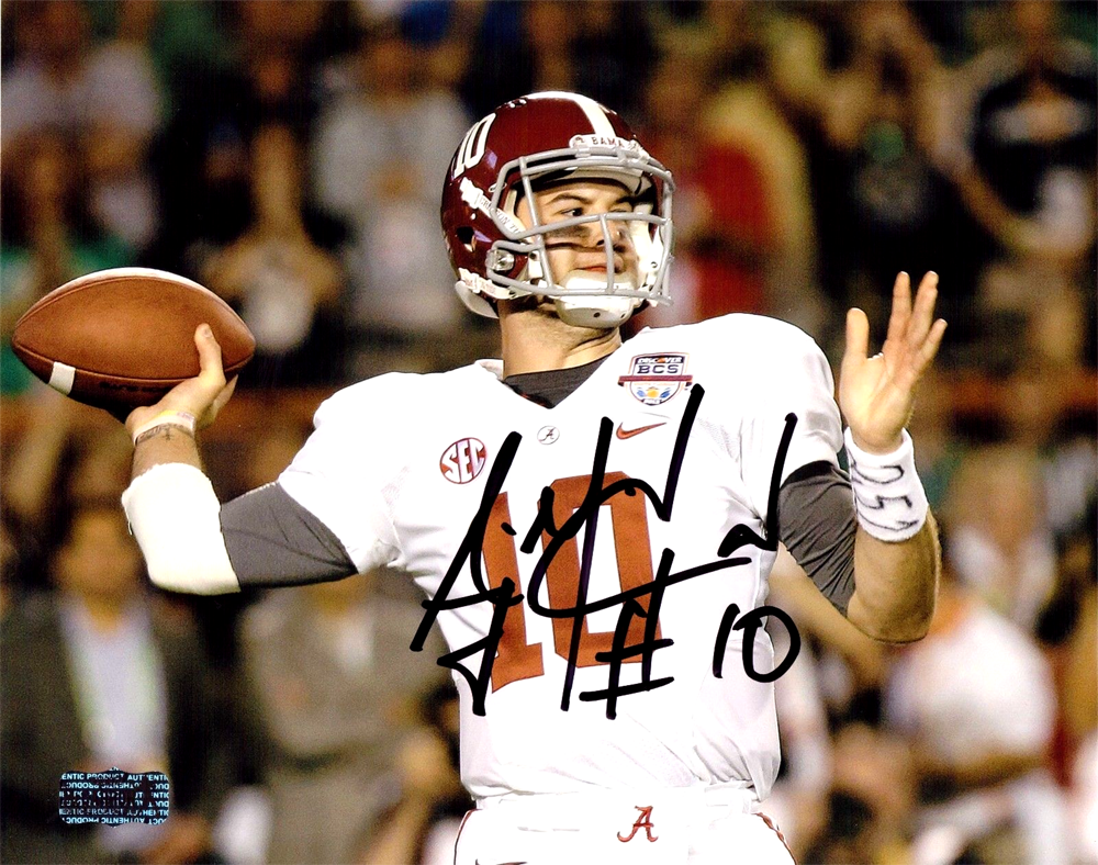 An Alabama Crimson Tide 8x10 Photo - Close Up White Jersey hand signed by AJ McCarron. The item and signature are in excellent condition - AJ set the SEC on fire at Alabama and now looks to make his mark on the NFL.AUTHENTICATION: The item is accompanied by an AJ McCarron Exclusive Certificate of Authenticity - AJ McCarron Exclusive Serial Numbered and Databased Hologram - Picture of AJ from the Signings