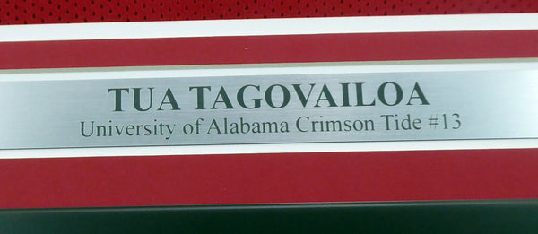 This is a Framed Red Custom Jersey, approximately 31x36 with the frame, that has been hand signed by Tua Tagovailoa. This is a custom jersey with no name brand. The approximate size is XL. It has nice sewn in name and numbers. This item has been certified authentic by Beckett Authentication (BAS) and comes with their sticker and matching certificate of authenticity.