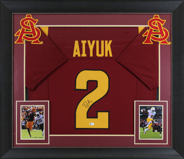 This Autographed Maroon Pro Style Framed Jersey has been Personally Signed by Brandon Aiyuk of the Arizona State Sun Devils. This item is 100% Authentic to include a Certificate of Authenticity (COA) / hologram by Beckett Authentication Services. This is a BAS Witnessed Protection Program item which means a Beckett Authentication Service representative was present when this item was being signed. This is a stock item. We conducted an autograph signing with Brandon Aiyuk and we have several of these available. The one you will receive will be of equal quality to the one pictured. This item can be verified through BAS Witnessed. This item has been professionally framed to overall dimensions of approximately 32 x 37 inches. This is a X-Large sized, non-branded, custom-stitched Framed Jersey. These jerseys are framed to order, it takes approximately 3-4 business days for framing to be completed.