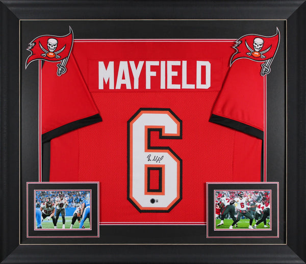 This Autographed Red Pro Style Framed Jersey has been Personally Signed by Baker Mayfield of the Tampa Bay Buccaneers. This item is 100% Authentic to include a hologram by Beckett Authentication Services. This item will come with an affixed Beckett Authentication Services (BAS) authentication sticker, which includes a scannable QR code to verify authenticity. Please note that Beckett no longer provides serial-numbered COA cards, and the attached BAS sticker will serve as the complete authentication for this item. This is a BAS Witnessed Protection Program item which means a Beckett Authentication Service representative was present when this item was being signed. We conducted an autograph signing with Baker Mayfield where multiples of the same item were signed. While the photographs are representative of this item, the size, placement and strength of the signature may vary. Each item is hand signed, therefore, each autograph is unique. This item can be verified through BAS Witnessed. This item has been professionally framed to overall dimensions of approximately 32 x 37 inches. This is a X-Large sized, non-branded, custom-stitched Framed Jersey. This jersey will be framed to order, it will take approximately 3-4 business days from purchase date for it to ship.