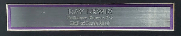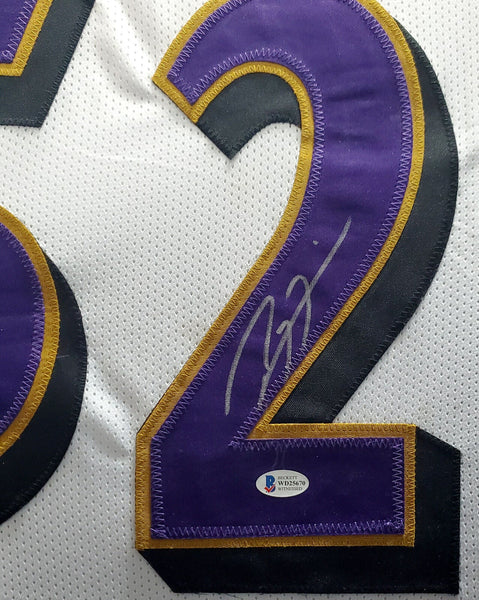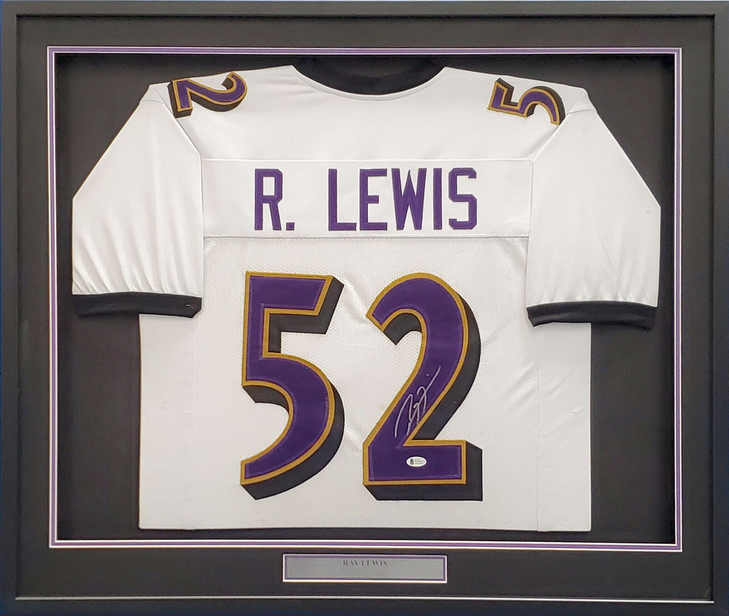 This is a Framed White Custom Jersey, approximately 31x36 with the frame, that has been hand signed by Ray Lewis. This is a custom jersey with no name brand. The approximate size is XL. It has nice sewn in name and numbers.A This item has been certified authentic by Beckett (BAS) and comes with their tamper-proof sticker and matching certificate of authenticity.