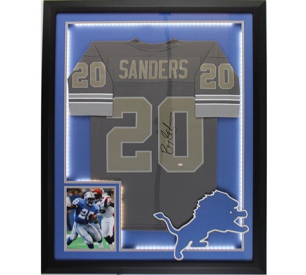 A Detroit Lions LED Framed Mitchell & Ness Replica Charcoal NFL Jersey hand signed by Barry Sanders. The item and signature are in excellent condition. The frame measures approximately 36"x44" and features an 8x10 of Barry. Barry is a 10x Pro Bowler, 10x All-Pro, 4x Rushing Champion, and NFL MVP. AUTHENTICATION: The item is accompanied by a Schwartz Sports Certificate of Authenticity - Schwartz Sports Serial Numbered & Databased Hologram