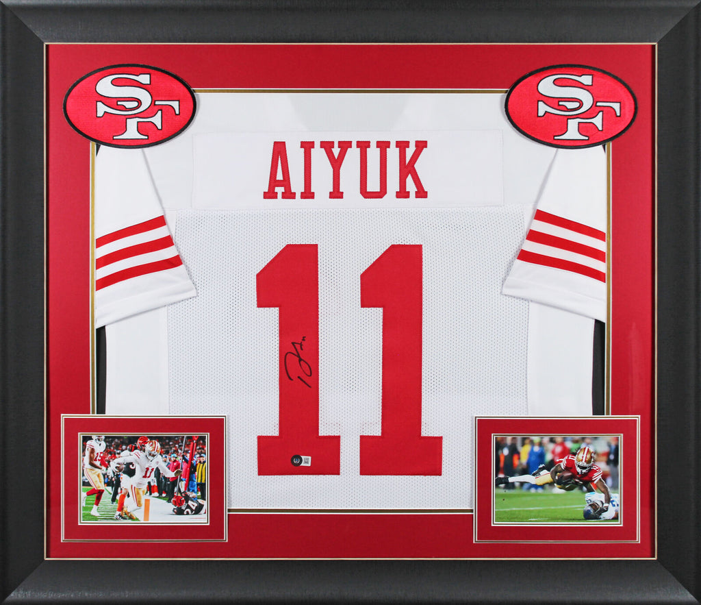 This Autographed White Pro Style Framed Jersey has been Personally Signed by Brandon Aiyuk of the San Francisco 49ers. This item is 100% Authentic to include a hologram by Beckett Authentication Services. This item will come with an affixed Beckett Authentication Services (BAS) authentication sticker, which includes a scannable QR code to verify authenticity. Please note that Beckett no longer provides serial-numbered COA cards, and the attached BAS sticker will serve as the complete authentication for this item. This is a BAS Witnessed Protection Program item which means a Beckett Authentication Service representative was present when this item was being signed. We conducted an autograph signing with Brandon Aiyuk where multiples of the same item were signed. While the photographs are representative of this item, the size, placement and strength of the signature may vary. Each item is hand signed, therefore, each autograph is unique. This item can be verified through BAS Witnessed. This item has been professionally framed to overall dimensions of approximately 32 x 37 inches. This jersey will be framed to order, it will take approximately 3-4 business days from purchase date for it to ship.