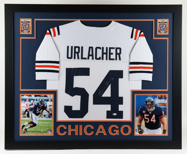 Custom framed display measures 35" x 43" in size and features a jersey that has been hand-signed by Brian Urlacher (HOF).The lot / autograph(s) includes an official Beckett Authentication Services serially-numbered hologram for authenticity purposes. The signing of this item was witnessed by Beckett.Authentication: Beckett Hologram