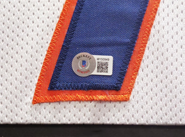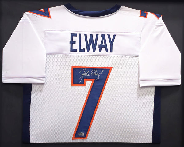 This is a framed White & Blue Jersey, approximately 31x36 with the frame, that has been hand signed by John Elway. This item has been witnessed and certified authentic by Beckett Authentication (BAS) and comes with their tamper-proof witness hologram.