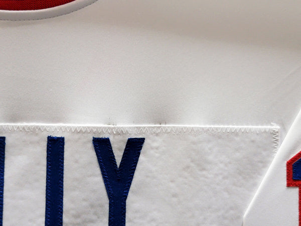 This is a framed White Jersey, approximately 31x36 with the frame, that has been hand signed by Jim Kelly. This is a custom jersey with no name brand. The approximate size is XL. It has nice sewn in name and numbers. This item has been witnessed and certified authentic by Beckett Authentication (BAS) and comes with their tamper-proof witness sticker. Beckett Authentication has recently changed their physical certificate card policy where they no longer match their tamper-proof sticker with a physical certificate. A certificate can be printed on Beckett's website for the matching authentication number.