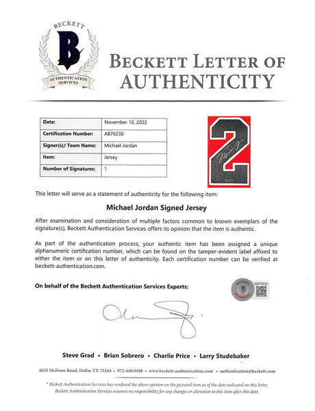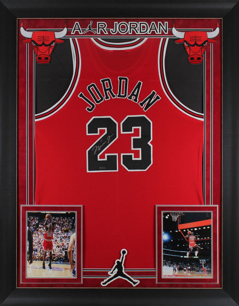 This Autographed Red Framed Jersey has been Personally Signed by Michael Jordan of the Chicago Bulls. This item is 100% Authentic to include a Certificate of Authenticity (COA) / hologram by Beckett Authentication Services. This item is 100% Authentic to include a hologram by UDA, it does not come with a matching COA. The authenticity can be verified on Beckett Authentication Services website. This item has been professionally framed to overall dimensions of approximately 36.5 x 44.5 inches. This is a X-Large sized Framed Jersey.