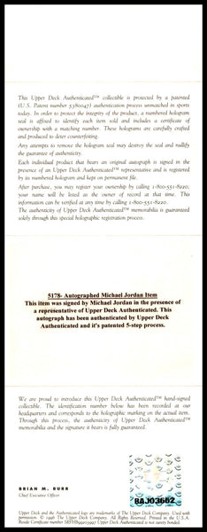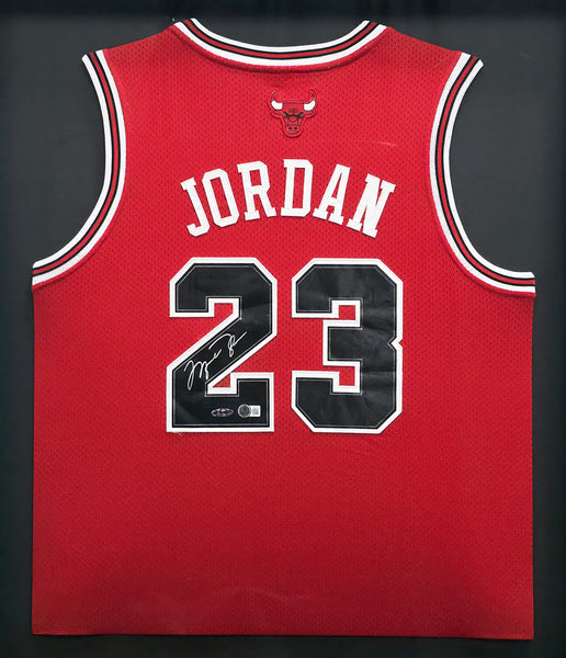 This is a Framed Red Jersey, approximately 31x36 with the frame, that has been hand signed by Michael Jordan. This item has been certified authentic by Upper Deck Authentication (UDA) and comes with their tamper-proof hologram and matching full-page certificate of authenticity.
