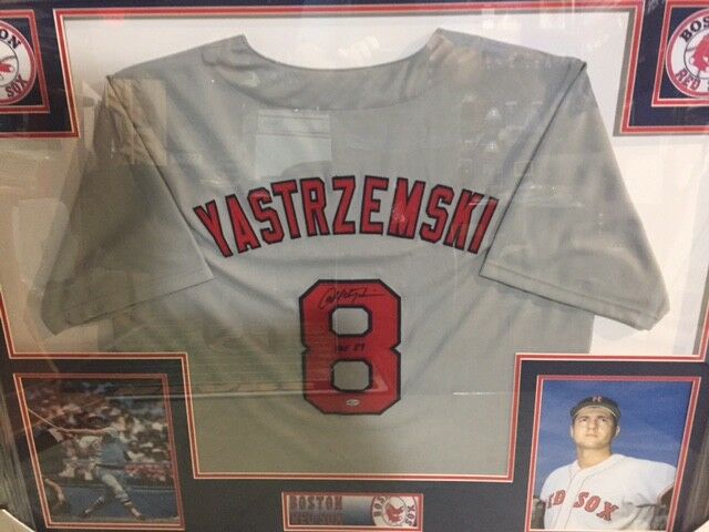 Custom frame measures approximately 35" x 43" in size and features a jersey which has been hand-signed in black paint pen by Carl Yastrzemski 1967 American League MVP and Triple Crown Winner The autograph includes an official Sports Fever hologram and Matching COA for authenticity purposes.