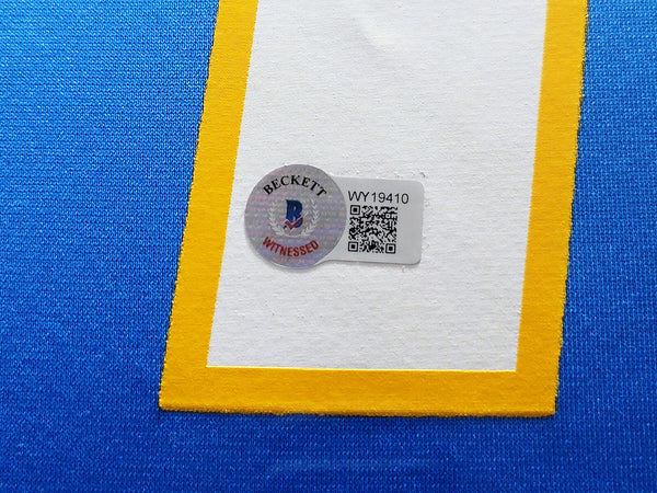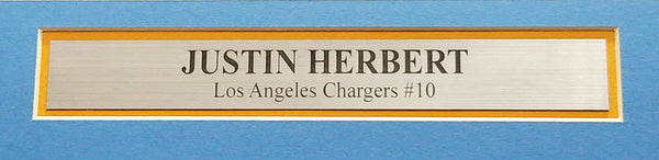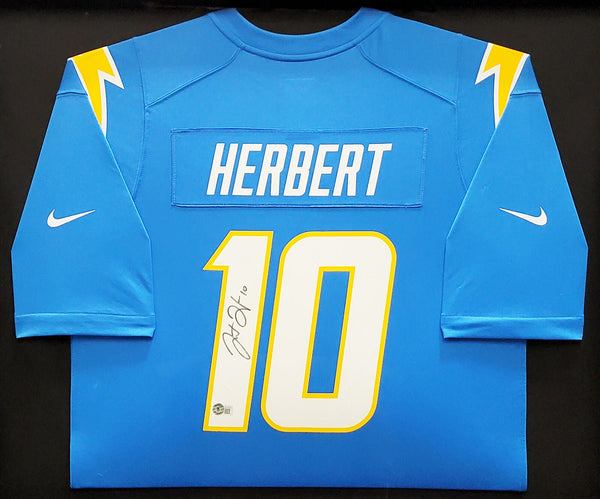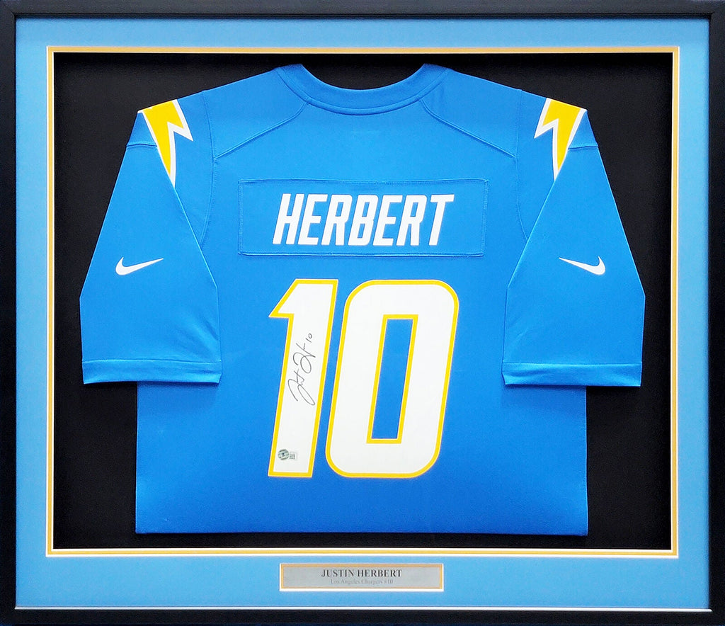 This is a framed Powder Blue Nike Los Angeles Chargers Jersey, approximately 31x36 with the frame, that has been hand signed by Justin Herbert. This item has been witnessed and certified authentic by Beckett Authentication (BAS) and comes with their tamper-proof witness sticker. Beckett Authentication has recently changed their physical certificate card policy where they no longer match their tamper-proof sticker with a physical certificate. A certificate can be printed on Beckett's website for the matching authentication number.