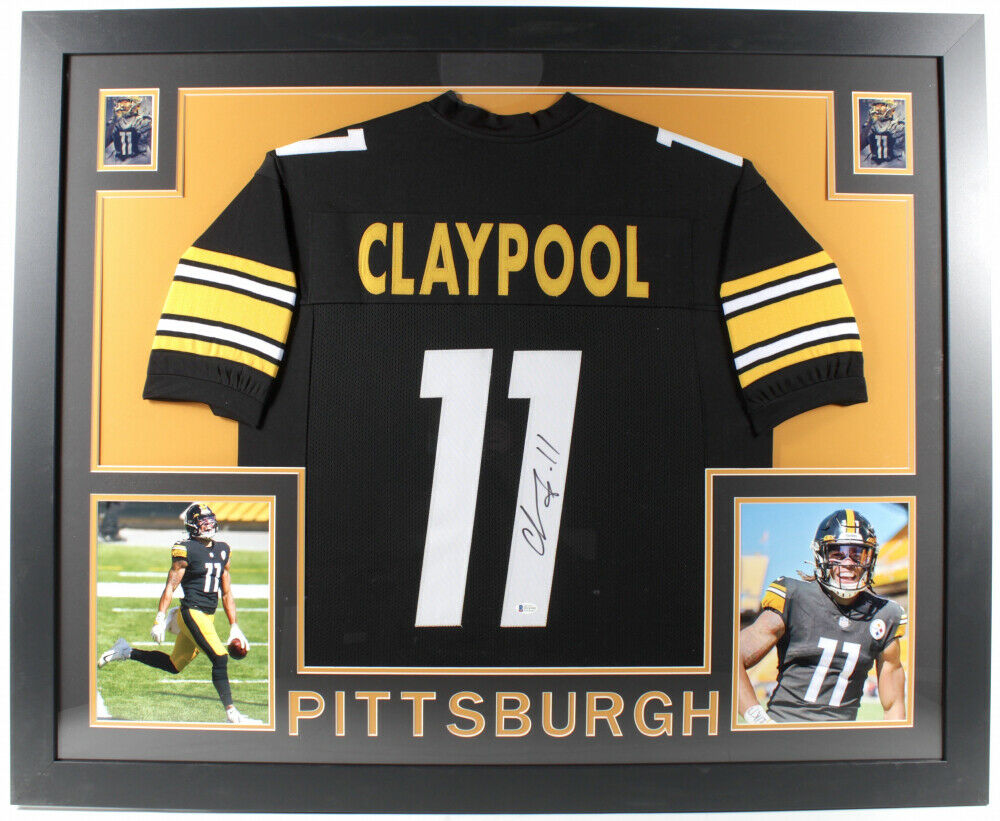 Custom frame measures approximately 35" x 43" in size and features a jersey that has been hand-signed by Chase Claypool.The lot / autograph(s) includes an official Beckett Authentication Services serially-numbered hologram and matching COA for authenticity purposes. The signing of this item was witnessed by Beckett.Authentication: Beckett COA