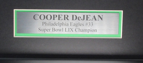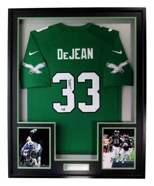Cooper DeJean Philadelphia Eagles Autographed Jersey Framed. The outer frame size is 33 inches x 42 inches. This jersey is authenticated by Fanatics Authentic and includes their Tamper-proof Hologram Sticker.