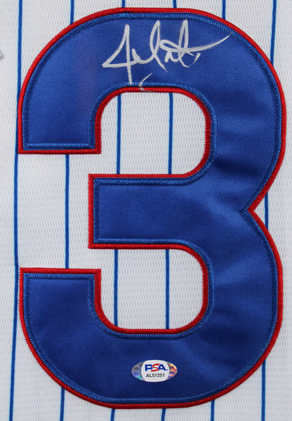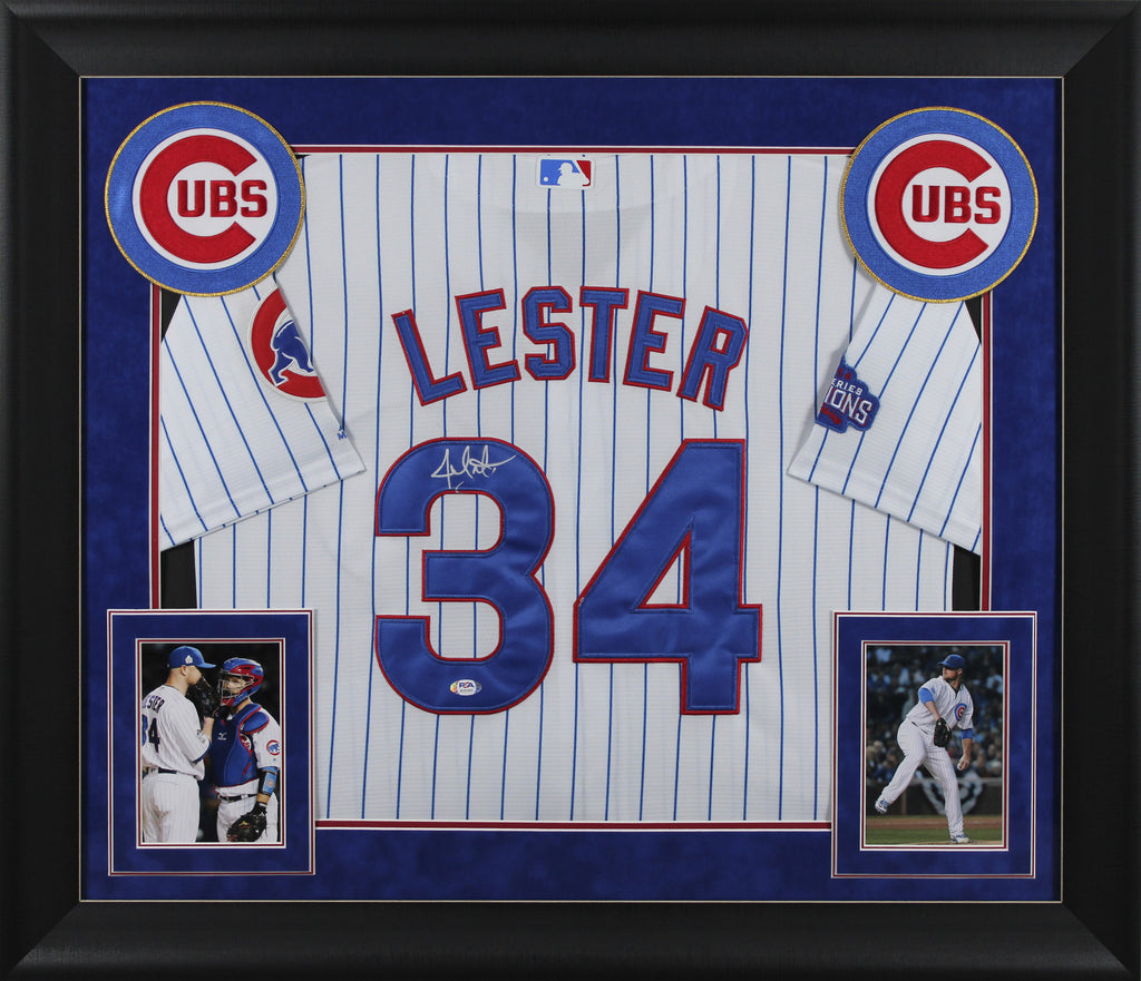 This Autographed White Pinstripe Majestic Framed Jersey has been Personally Signed by Jon Lester of the Chicago Cubs. This item is 100% Authentic and comes with a PSA/DNA Certification numbered Hologram. Please note that PSA/DNA no longer provides serial-numbered COA cards, and the attached PSA/DNA sticker will serve as the complete authentication for this item. The authenticity can be verified on Professional Sports Authenticators website. This item has been professionally framed to overall dimensions of approximately 32 x 37 inches.
