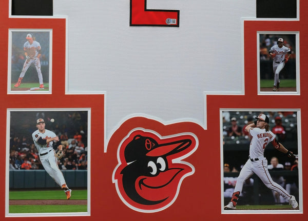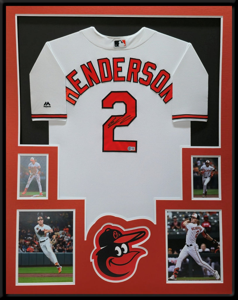 Custom Framed Gunnar Henderson hand signed Baltimore Orioles jerseyA true one of a kind piece for the serious collector.Beckett HologramThe authentication is from Beckett. This signature is witness authenticated by a representative of Beckett. 100% AUTHENTIC. The jersey has fully stitched numbers on the front and back. It is a great item and a must for all great sports fans!This item is professionally framed, it measures 32"x40" inside , 42"x34" outside , using UV protective Acrylic glass for safe keeping and safe transport, team color matting, black moulding and hanging hooks on the back. All additional items in frame seen in pictures included. 100% ready to hang in your fan cave.