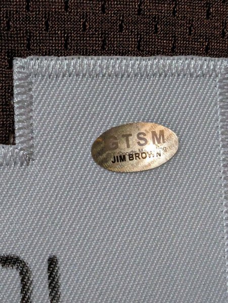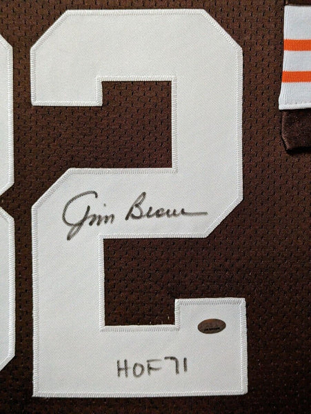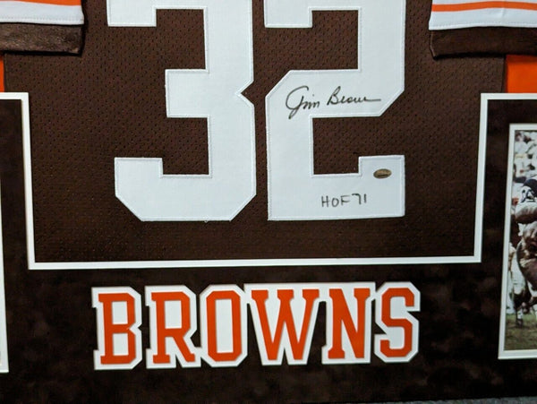 Custom Framed in SUEDE Jim Brown hand signed Cleveland Browns style custom jersey."HOF 71" InscribedGTSM HologramThe authentication is from GTSM. This signature is authenticated by a representative of GTSM! 100% AUTHENTIC!!! The jersey has fully stitched numbers on the front and back. It is a great item and a must for all great sports fans.This item is professionally framed, it measures 32"x40" inside , 42"x34" outside , using UV protective Acrylic glass for safe keeping and safe transport, SUEDE team color matting, black moulding and hanging hooks on the back. All additional items in frame seen in pictures included. 100% ready to hang in your fan cave.