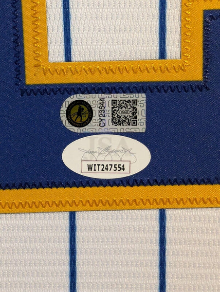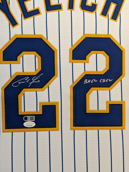 Framed Christian Yelich signed Milwaukee Brewers Style Custom Jersey. JSA Hologram and COAThe authentication is from JSA. This signature is authenticated by a representative of JSA! 100% AUTHENTIC!!! The jersey has fully stitched numbers on the front and back. No tags or logos. This is not an official MLB jersey but it is very high quality. It is a great item and a must for all great sports fans! This item is professionally framed, it measures 32"x40" inside , 42"x34" outside , using UV protective Acrylic glass for safe keeping and safe transport, team color matting, black moulding and hanging hooks on the back. All additional items in frame seen in pictures included. 100% ready to hang in your fan cave.