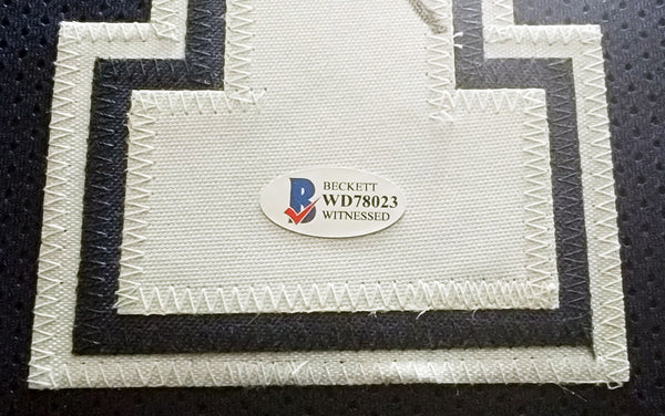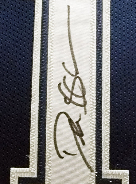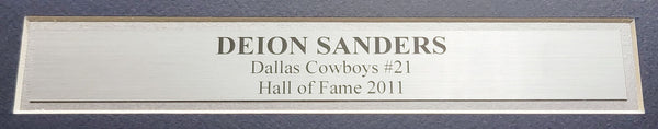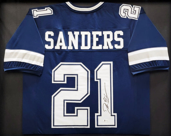 This is a framed Blue Jersey, approximately 31x36 with the frame, that has been hand signed by Deion Sanders. This is a custom jersey with no name brand. The approximate size is XL. It has nice sewn in name and numbers. This item has been certified authentic by Beckett Authentication (BAS) and comes with their tamper-proof sticker and matching certificate of authenticity.