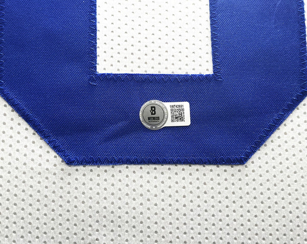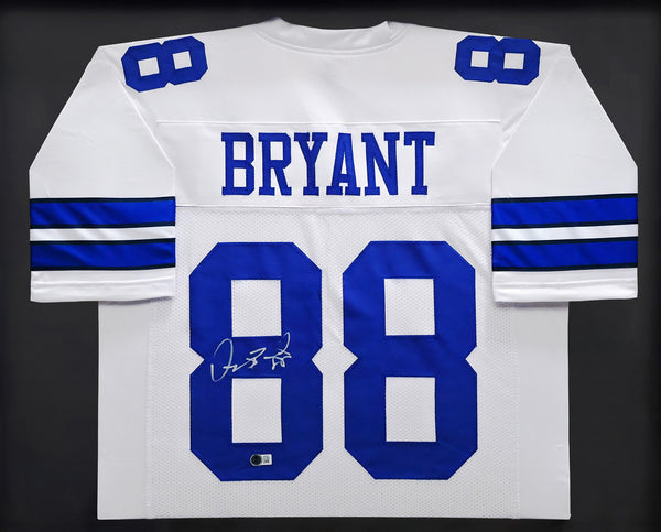 This is a framed White Jersey, approximately 31x36 with the frame, that has been hand signed by Dez Bryant. This is a custom jersey with no name brand. The approximate size is XL. It has nice sewn in name and numbers. This item has been witnessed and certified authentic by Beckett Authentication (BAS) and comes with their tamper-proof witness hologram.