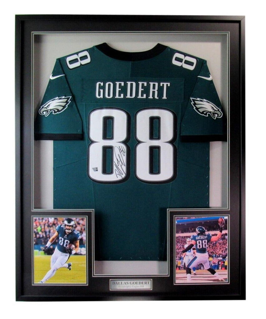 Dallas Goedert Signed/Autographed Football Jersey Philadelphia Eagles Framed. The outer frame size is 33 inches x 42 inches. This Jersey is authenticated by Fanatics and includes their tamper proof hologram sticker.