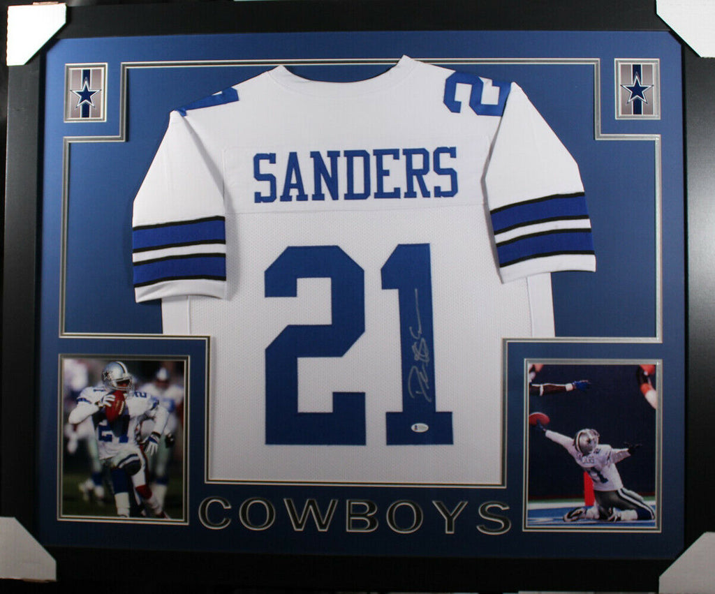 Deion Sanders Autographed/Signed Dallas Framed White XL Jersey BAS 32970 The number in the listing title is just an inventory sku for our records and is not the authentication number. This is a professionally framed custom pro style white XL jersey with sewn on name and numbers that was personally autographed by Deion Sanders. Includes a certificate of authenticity from Beckett Authentication Services (BAS) and Denver Autographs.