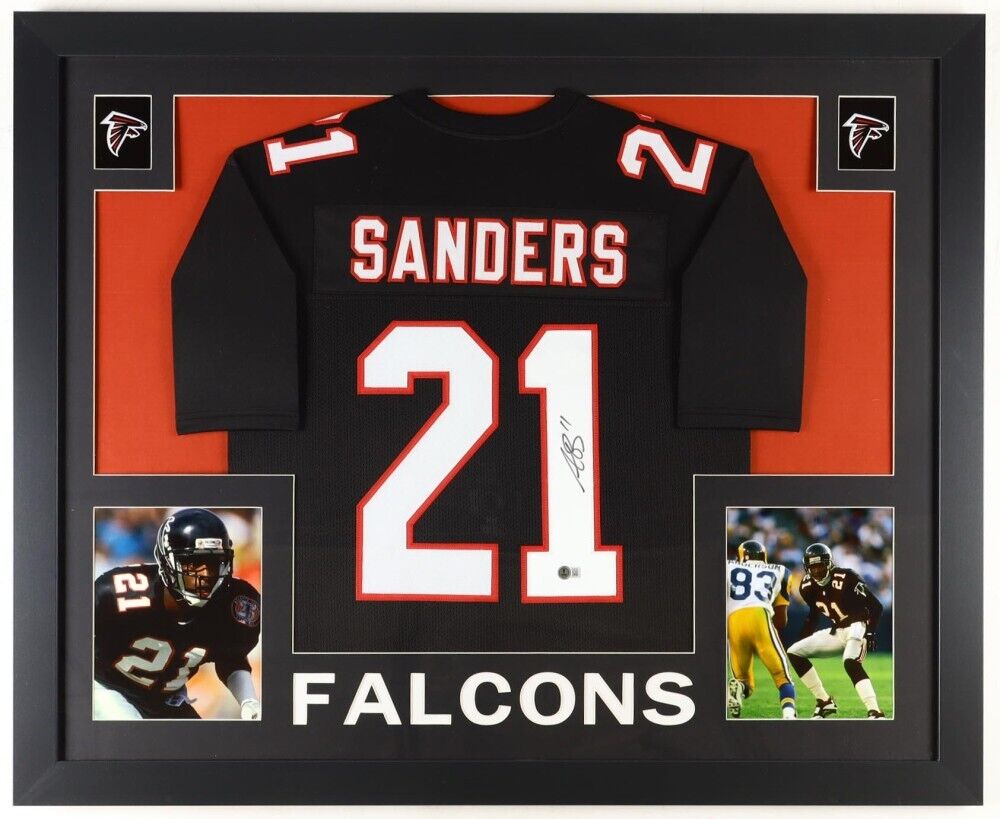 Custom frame measures approximately 34" x 42" in size and features a jersey that has been hand signed by Deion Sanders (HOF).The autograph includes an official Beckett Authentication Services serially numbered hologram and QR Code Card for authenticity purposes. The signing of this item was witnessed by Beckett. Authentication: Beckett Hologram with QR Code Card
