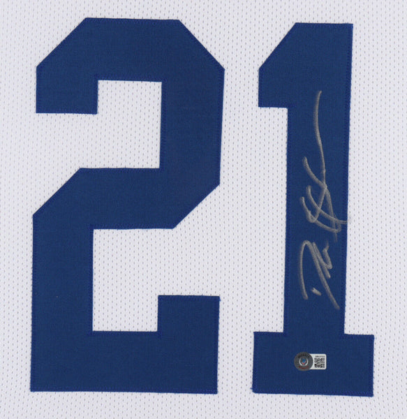 Custom frame measures approximately 35" x 43" in size and features a custom on-field style jersey that has been hand-signed by Deion Sanders (HOF).The lot / autograph(s) includes an official Beckett Authentication Services serially-numbered hologram for authenticity purposes. The signing of this item was witnessed by Beckett.Authentication: Beckett Hologram