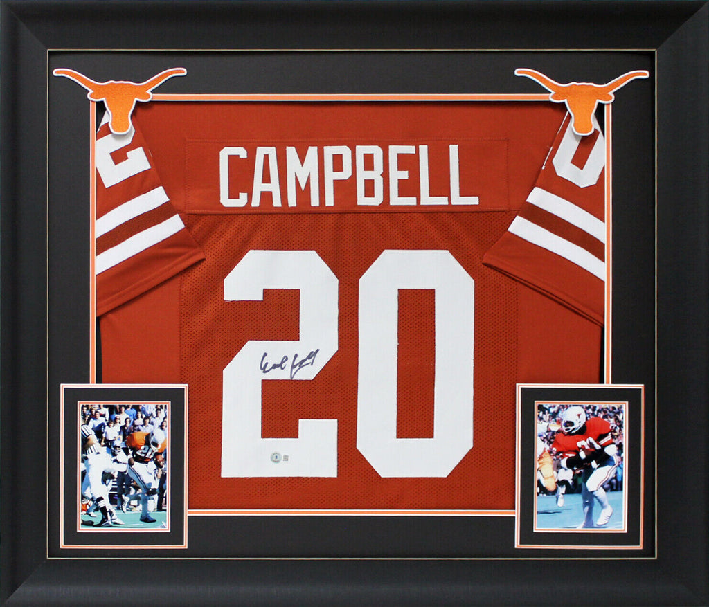 This Autographed Burnt Orange Pro Style Framed Jersey has been Personally Signed by Earl Campbell of the Texas Longhorns. This item is 100% Authentic to include a hologram by Beckett Authentication Services. This item will come with an affixed Beckett Authentication Services (BAS) authentication sticker, which includes a scannable QR code to verify authenticity. Please note that Beckett no longer provides serial-numbered COA cards, and the attached BAS sticker will serve as the complete authentication for this item. This is a BAS Witnessed Protection Program item which means a Beckett Authentication Service representative was present when this item was being signed. We conducted an autograph signing with Earl Campbell where multiples of the same item were signed. While the photographs are representative of this item, the size, placement and strength of the signature may vary. Each item is hand signed, therefore, each autograph is unique. This item can be verified through BAS Witnessed. This item has been professionally framed to overall dimensions of approximately 32 x 37 inches. This is a X-Large sized, non-branded, custom-stitched Framed Jersey. This jersey will be framed to order, it will take approximately 3-4 business days from purchase date for it to ship.