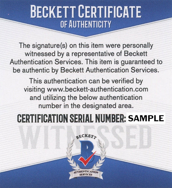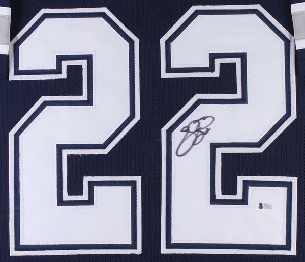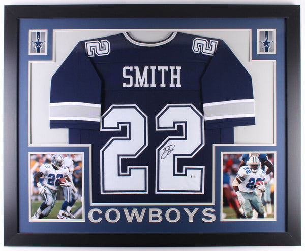 Custom frame measures approximately 35" x 43" in size and features a jersey which has been hand-signed in black felt-tip pen by Emmitt Smith (HOF). Includes an official Beckett Authentication Services serially numbered hologram and matching COA for authenticity purposes. The signing of this item was witnessed by Beckett.Authentication: Beckett COA