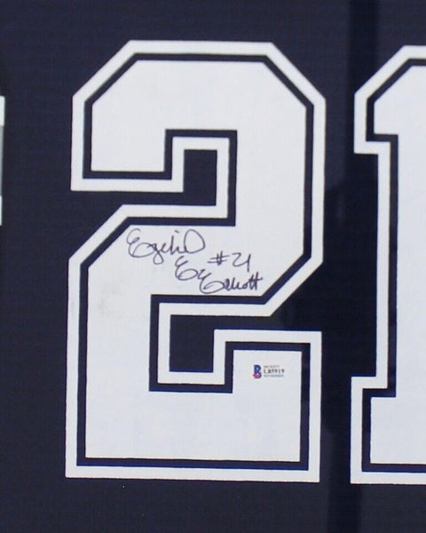 A Dallas Cowboys LED Framed Nike Game Style Blue NFL Jersey hand signed by Ezekiel Elliott. The item and signature are in excellent condition. The Frame Measures approximately 36''x44'' and features an 8x10 photo of Ezekiel. Ezekiel is a running back for the Dallas Cowboys. He played college football at Ohio State, where he earned second-team All-America honors in 2015. He was drafted by the Cowboys fourth overall in the 2016 NFL Draft. In his first NFL season, he led the league in rushing yards and was invited to the Pro Bowl. AUTHENTICATION: The item is accompanied by a Beckett Certificate of Authenticity - Beckett Serial Numbered and Databased Hologram - Picture of Ezekiel from the Signing