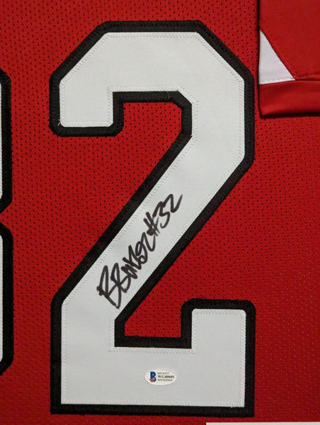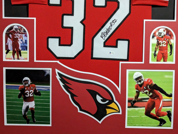 Framed Budda Baker hand signed Arizona Cardinals style custom jersey.Beckett COAThe authentication is from Beckett. This signature is authenticated by a representative of Beckett! 100% AUTHENTIC!!! The jersey has fully stitched numbers on the front and back. No tags or logos. This is not an official NFL jersey but it is very high quality. It is a great item and a must for all great sports fans!This item is professionally framed, it measures 32"x40" inside , 42"x34" outside , using UV protective Acrylic glass for safe keeping and safe transport, team color matting, black moulding and hanging hooks on the back. All additional items in frame seen in pictures included. 100% ready to hang in your fan cave.