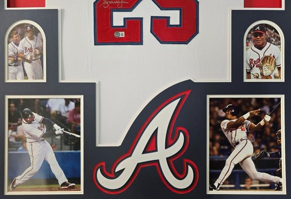 Custom Framed Andruw Jones hand signed Atlanta Braves style custom jersey.Beckett HologramThe authentication is from BAS. This signature is WITNESSED by a representative of BAS! 100% AUTHENTIC!!! The jersey has fully stitched numbers on the front and back. It is a great item and a must for all great sports fans!This item is professionally framed, it measures 32"x40" inside , 42"x34" outside , using UV protective Acrylic glass for safe keeping and safe transport, team color matting, black moulding and hanging hooks on the back. All additional items in frame seen in pictures included. 100% ready to hang in your fan cave.