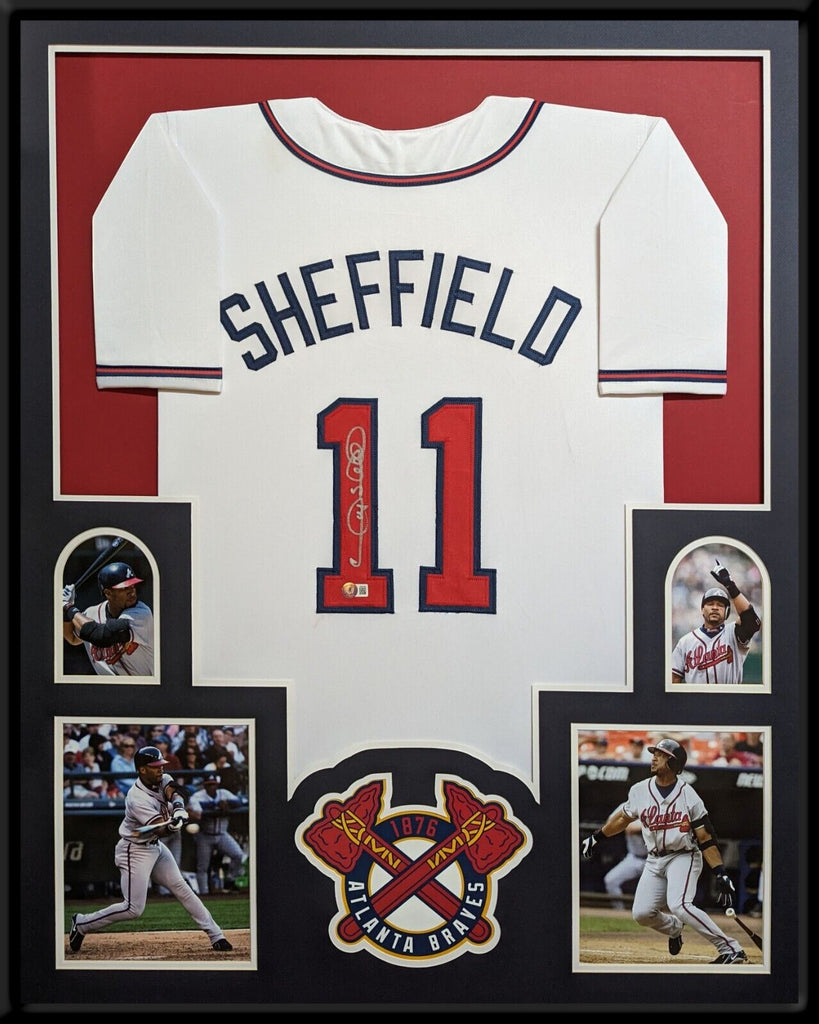 Custom Framed Gary Sheffield hand signed Atlanta Braves style custom jersey.Beckett HologramThe authentication is from BAS. This signature is WITNESSED by a representative of BAS! 100% AUTHENTIC!!! The jersey has fully stitched numbers on the front and back. It is a great item and a must for all great sports fans!This item is professionally framed, it measures 32"x40" inside , 42"x34" outside , using UV protective Acrylic glass for safe keeping and safe transport, team color matting, black moulding and hanging hooks on the back. All additional items in frame seen in pictures included. 100% ready to hang in your fan cave.