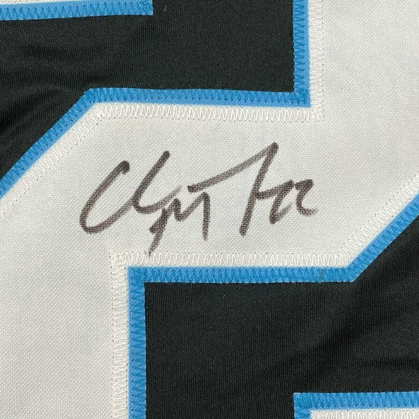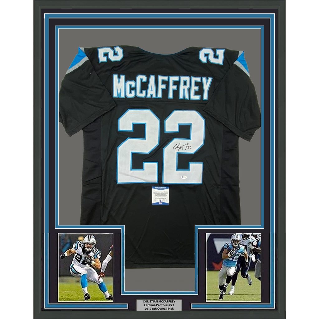 Framed Autographed Christian McCaffrey 33x42 Carolina Black Jersey Beckett COA