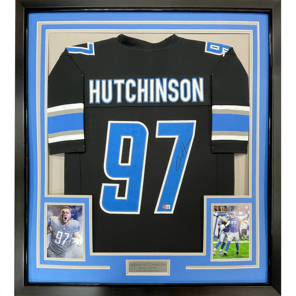 Framed Autographed/Signed Aidan Hutchinson 33x42 Detroit Black Jersey BAS COA The item is professionally framed and matted with two 5x7 photos, measures 35x39 inches and is ready to be hung in your man cave! Photo and matting requests can be made.