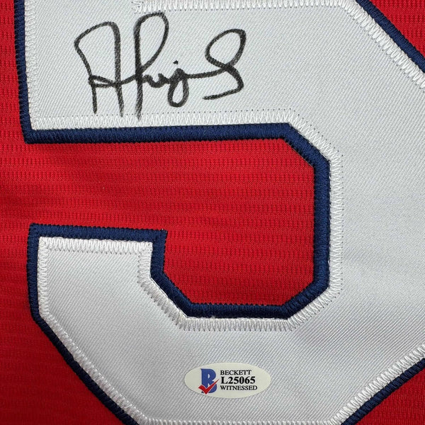 Framed Autographed/Signed Albert Pujols 35x39 St. Louis Red Jersey Beckett COA The item is professionally framed and matted with two 5x7 photos, measures 35x39 inches and is ready to be hung in your man cave! Photo and matting requests can be made.