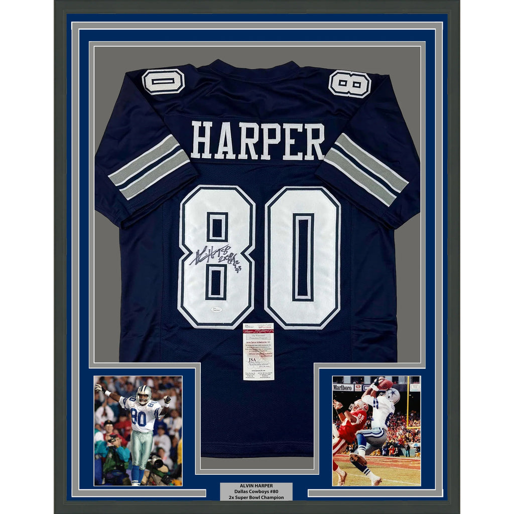 Framed Autographed/Signed Alvin Harper 33x42 2x SB Champ Blue Jersey JSA COA The item is professionally framed and matted with two 5x7 photos, measures 35 inches by 39 inches and is ready to be hung in your man cave! Photo and matting requests can be made.