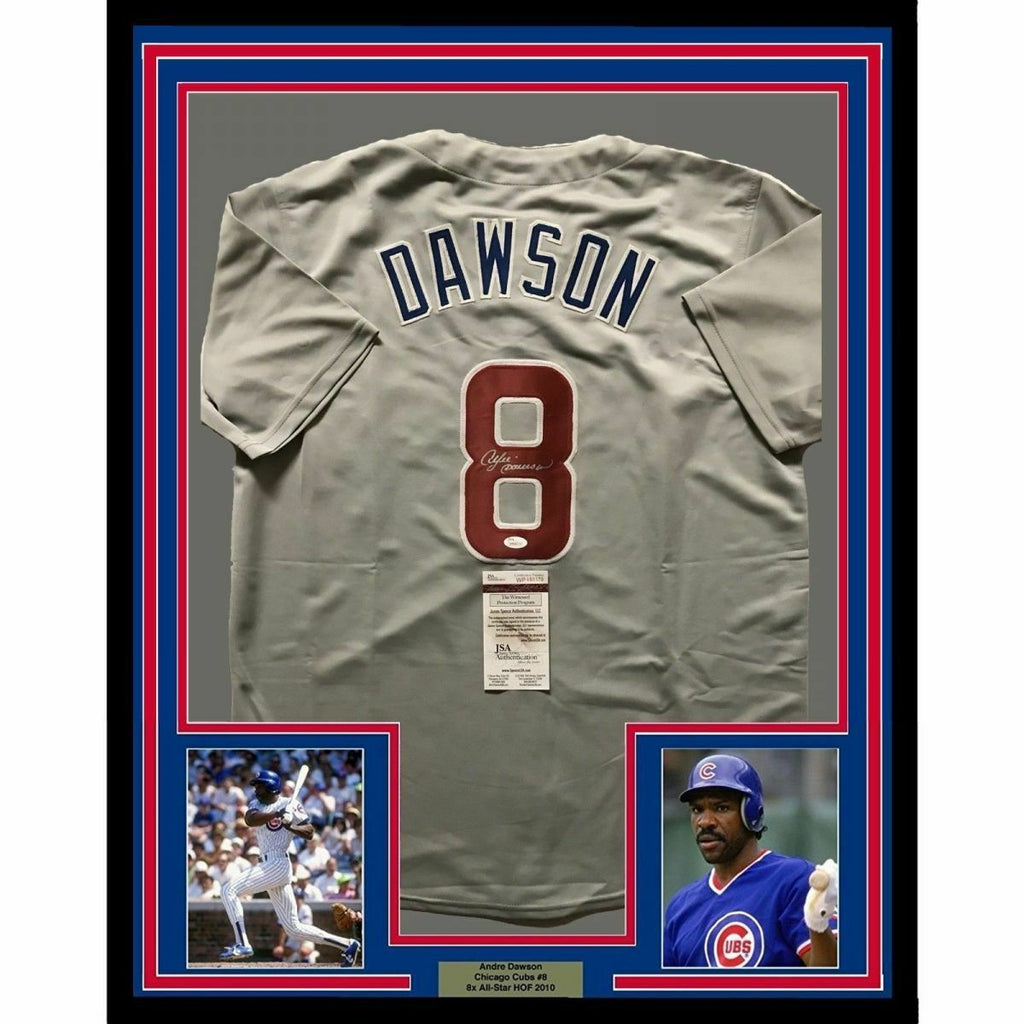 FRAMED Autographed/Signed ANDRE DAWSON 33x42 Chicago Grey Jersey JSA COA Auto The item is professionally framed & matted with two 8x10 photos, measures 33"x42" and is ready to be hung in your man cave! NOTE: COA card will be mounted on the back of the frame, not inside it on top of the jersey as seen in the picture.