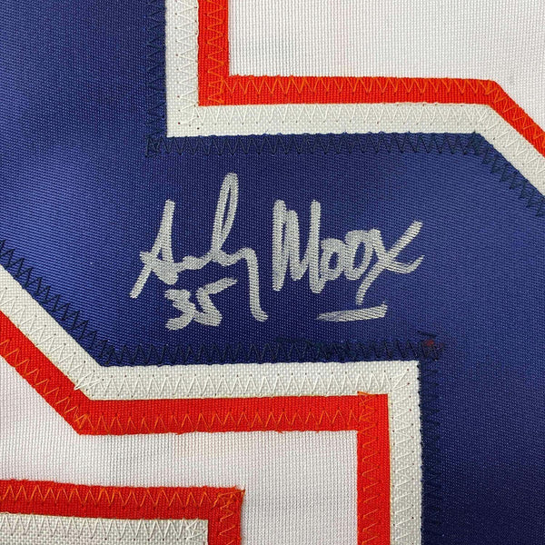 Framed Autographed/Signed Andy Moog 33x42 Edmonton White Hockey Jersey JSA COA