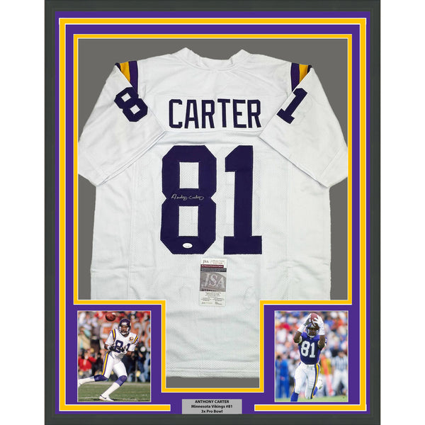 Framed Autographed/Signed Anthony Carter 35x39 Minnesota White Football Jersey J The item is professionally framed and matted with two 5x7 photos, measures 35x39 inches and is ready to be hung in your man cave! Photo and matting requests can be made.