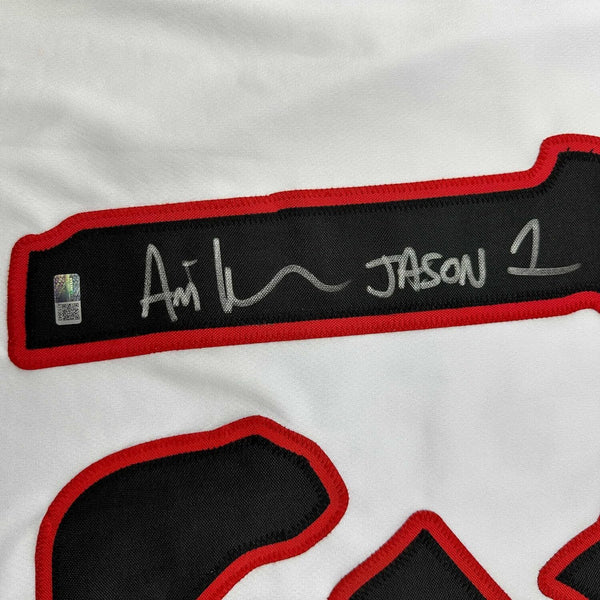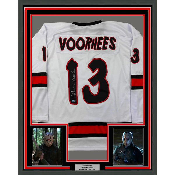Framed Autographed/Signed Ari Lehman 33x42 White Movie Jersey Steiner CX COA The item is professionally framed and matted with two 5x7 photos, measures 35 inches by 39 inches and is ready to be hung in your man cave! Photo and matting requests can be made.