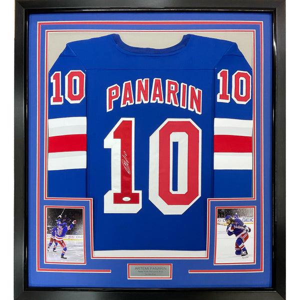 Framed Autographed/Signed Artemi Panarin 33x42 New York Blue Jersey JSA COA The item is professionally framed and matted with two 5x7 photos, measures 35x39 inches and is ready to be hung in your man cave! Photo and matting requests can be made.