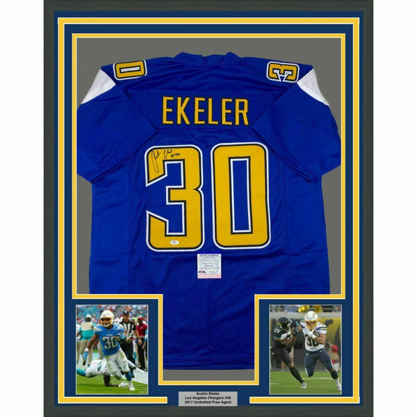 FRAMED Autographed/Signed AUSTIN EKELER 33x42 LA Color Rush Jersey PSA/DNA COA The item is professionally framed & matted with two 8x10 photos, measures 33"x42" and is ready to be hung in your man cave! NOTE: COA card will be mounted on the back of the frame, not inside it on top of the jersey as seen in the picture. Please allow up to 5 business days for the item to be framed, packaged safely, and picked up by USPS. Photo and matting requests can be made.