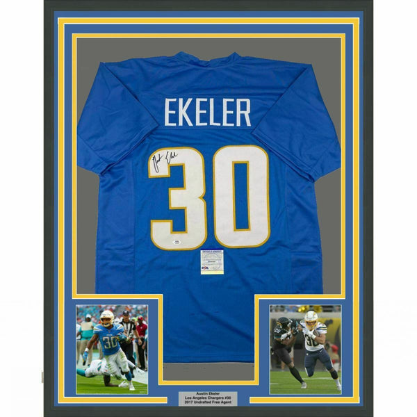 FRAMED Autographed/Signed AUSTIN EKELER 33x42 LA Powder Blue Jersey PSA/DNA COA The item is professionally framed & matted with two 8x10 photos, measures 33"x42" and is ready to be hung in your man cave! NOTE: COA card will be mounted on the back of the frame, not inside it on top of the jersey as seen in the picture. Please allow up to 5 business days for the item to be framed, packaged safely, and picked up by USPS. Photo and matting requests can be made.