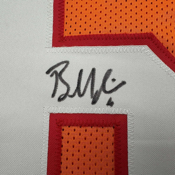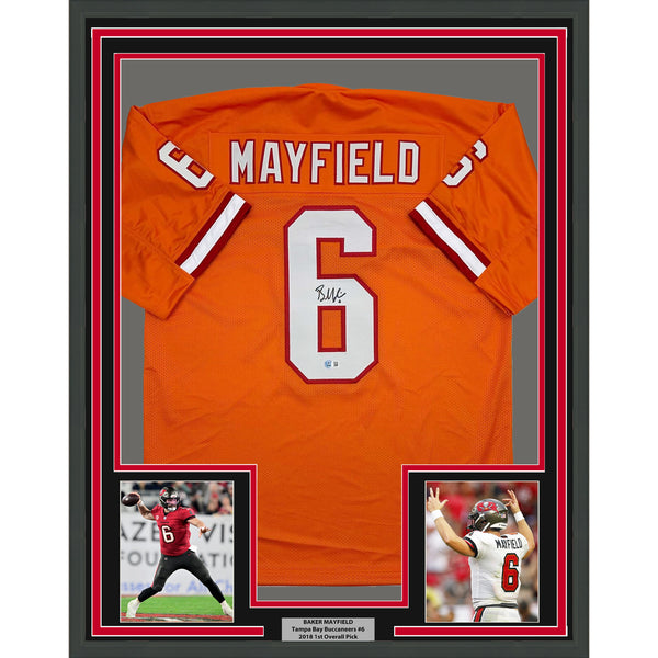 Framed Autographed/Signed Baker Mayfield 35x39 Tampa Bay Orange Jersey BAS COA The item is professionally framed and matted with two 5x7 photos, measures 35x39 inches and is ready to be hung in your man cave! Photo and matting requests can be made.