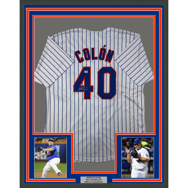 Framed Autographed/Signed Bartolo Colon 33x42 New York Pinstripe Jersey BAS COA The item is professionally framed and matted with two 5x7 photos, measures 35 inches by 39 inches and is ready to be hung in your man cave! Photo and matting requests can be made.