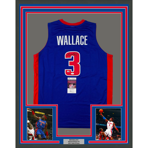 Framed Autographed/Signed Ben Wallace 33x42 Detroit Blue Jersey JSA COA The item is professionally framed & matted with two 8x10 photos, measures 33"x42" and is ready to be hung in your man cave! NOTE: COA card will be mounted on the back of the frame, not inside it on top of the jersey as seen in the picture.
