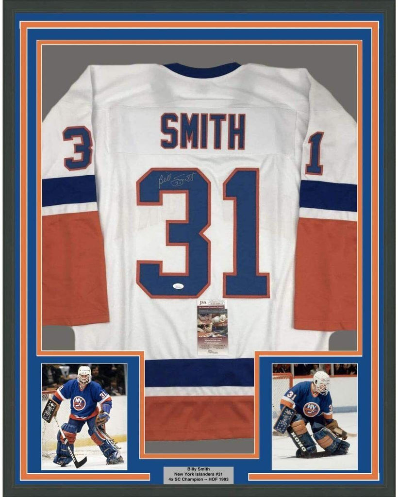 Framed Autographed/Signed Billy Smith 35x39 New York White Hockey Jersey JSA COA The item is professionally framed and matted with two 5x7 photos, measures 35 inches by 39 inches and is ready to be hung in your man cave! Photo and matting requests can be made.