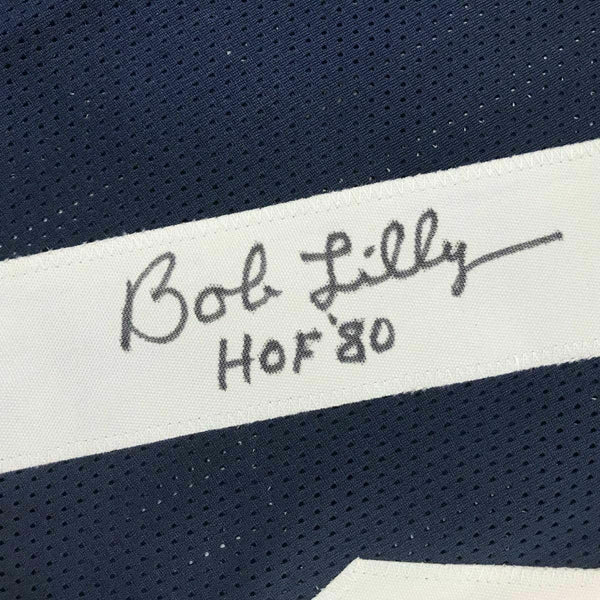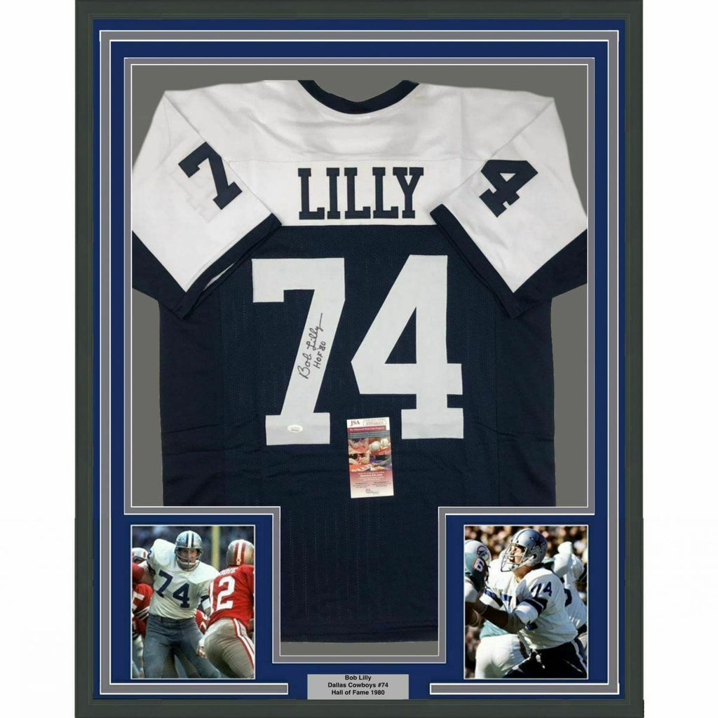 FRAMED Autographed/Signed BOB LILLY 33x42 Dallas Thanksgiving Day Jersey JSA COA The item is professionally framed & matted with two 8x10 photos, measures 33"x42" and is ready to be hung in your man cave! NOTE: COA card will be mounted on the back of the frame, not inside it on top of the jersey as seen in the picture.