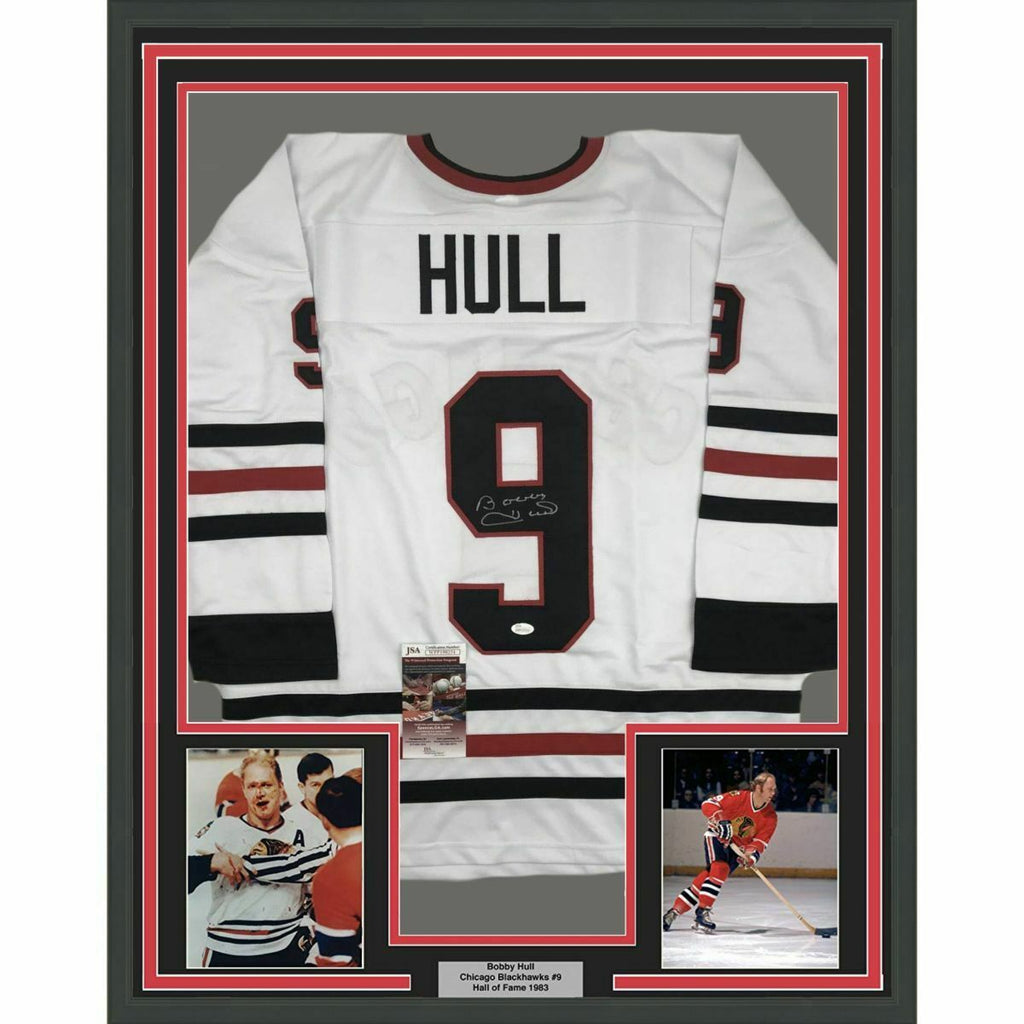 FRAMED Autographed/Signed BOBBY HULL 33x42 Chicago White Hockey Jersey JSA COA The item is professionally framed & matted with two 8x10 photos, measures 33"x42" and is ready to be hung in your man cave! NOTE: COA card will be mounted on the back of the frame, not inside it on top of the jersey as seen in the picture. Please allow up to 5 business days for the item to be framed, packaged safely, and picked up by USPS. Photo and matting requests can be made.
